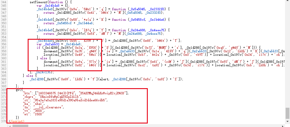 首先整个页面的JS是通过不同编码搞成了乱码,无法直接查看JS具体内容,但是通过第三方js执行工具执行发现执行后总是会跳转页面,因此考虑会和第一段浏览器跳转一样,最后发现了go()方法,而且看到go()方法调用的参数bts为我们需要的破解参数,破解与未破解区别如下:
